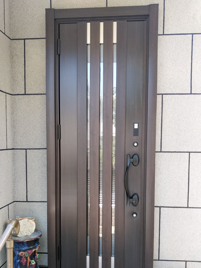 お客様と一緒に外装の色味を確認しながら玄関ドアの色柄を選びましたが、マッチして大変良かったです。さらに断熱仕様+カードタッチキーで断熱性・快適性・利便性・防犯性も向上したので大変喜んでいただけました。