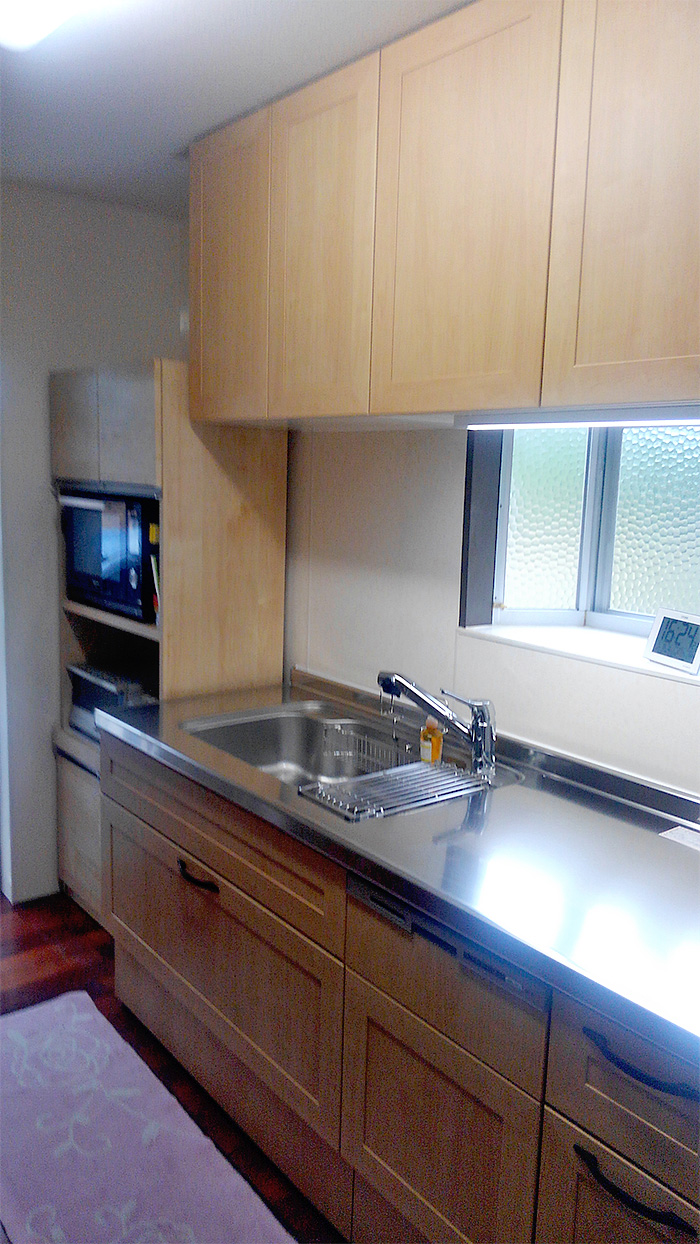 扉のめくれが気になっていましたので、剥がれにくい面材の扉をご提案させていただきました。食洗機の特典等もあり、ご満足のいくリフォームが出来たかと思います。
