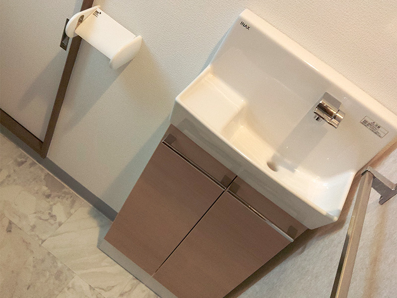 2年前にトイレ本体を取替させていただいていたので、今回はトイレは既存利用、手洗器と紙巻器を交換させていただきました。